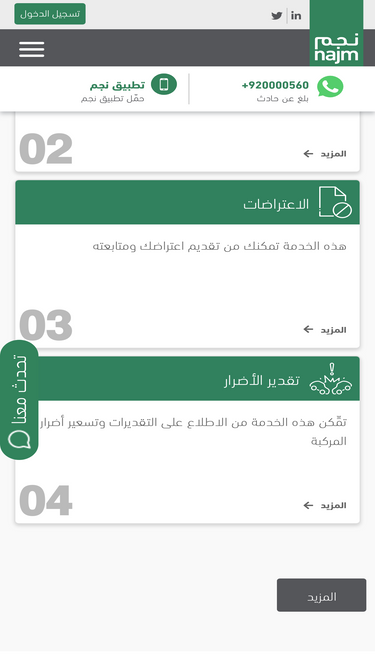 إطلاق خدمة للإستفسار عن خصم تأمين السيارات. ويمكنك الوصول لصفحة استحقاق خصم تأمين السيارات عبر الرابط. الإستعلام عن حالة وثائق التأمين تحديد مواقع فروع نجم بالخريطة ومعلومات الإتصال إرشادات ومعلومات تهمك.