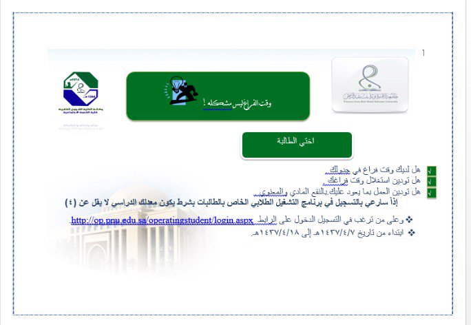 دعوة للمشاركة في برنامج التشغيل الطلابي دعوة للمشاركة في معرض تبر دعوة للمشاركة في معرض باب رزق جميل للتوظيف دعوة للمشاركة في ملتقى خطط بجامعة الاميرة نورة بنت عبدالرحمن. بدء تفعيل برنامج التشغيل الطلابي https t co zmtbjwewvn جامعة الأميرة نورة pnu.