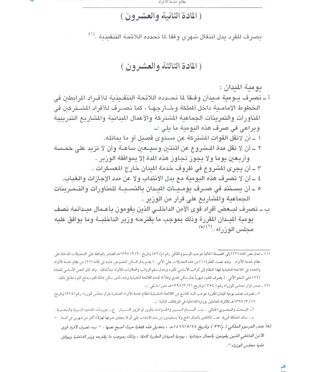 المادة ١٣ من نظام خدمة الافراد. المملكة العربية السعودية مرسوم ملكي 57 1405 4 11 1405. من المادة 56 من هذا النظام فإنه يحرم من أي حق في التعويض عن إجازاته ويعامل فيما عدا ذلك وفق نظام التقاعد العسكري. اللائحة التنفيذية لشئون الأفراد pdf. ج لا يجوز إعادة من ف صل من الخدمة أكثر من مرتين وفق ا للفقرة و من المادة 56.