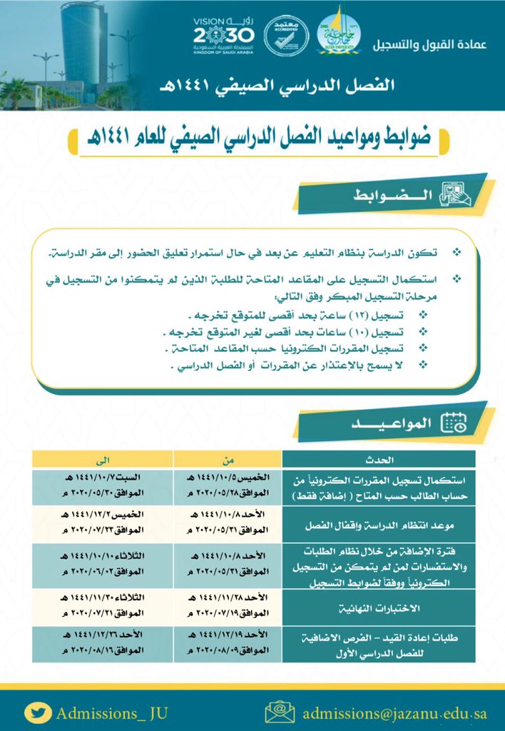 تسجيل في جامعة جازان. كشفت جامعة جازان عبر موقعها الإلكتروني الرسمي عن مواعيد القبول للعام الجامعي 1440 1441 هجرية وذلك لكافة الراغبين في الالتحاق بالجامعة لدرجتي البكالوريوس والدبلوم وخريجي وخريجات المرحلة الثانوية حيث أكد عميد القبول والتسجيل أحمد بن يحي فقيهي في بيان رسمي على أنه سوف. موعد بدء استقبال طلبات التسجيل في جامعة جازان. التحقق من وثيقة التخرج. أن تصبح عمادة القبول والتسجيل رائده في جامعة جازان منفردة على مستوى المملكة العربية السعودية من خلال تحقيق معايير الشفافية والعدالة واستخدام التقنية في كل ما يتعلق بإجراءات القبول والتسجيل واستقطاب أفضل الطلاب.