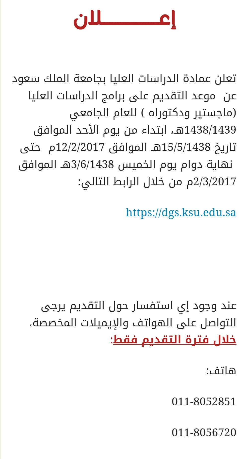 جامعة الملك سعود الدراسات العليا 1438. ويمكنكم زيارة موقع العمادة بالضغط هنا. للإطلاع على شروط القبول ببرامج الدراسات العليا للعام الدراسي 1439 1440 المتوف رة على الموقع الإلكتروني لعمادة الدراسات العليا. ولم تمض سوى سنوات ثلاث على إنشاء أول وزارة للمعارف حتى أعلن خادم الحرمين الشريفين الملك فهد بن عبد العزيز آل سعود رحمه الله وزير المعارف آنذاك في تصريح لوسائل الإعلام في عام 1376هـ ما يلي. Deanship of e transactions and communications.