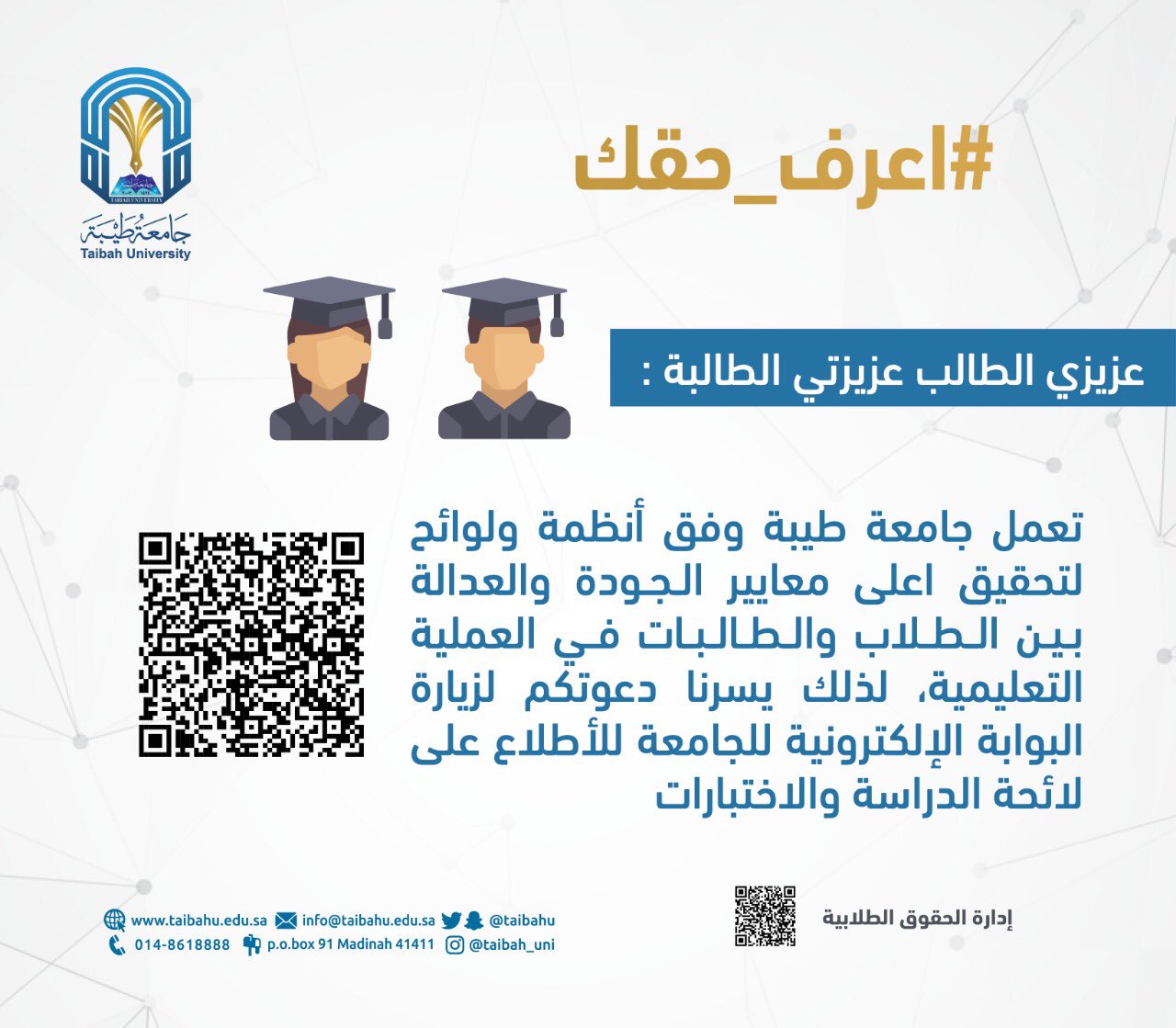 جامعة طيبة طلاب البوابة الالكترونية. شروط استخدام الخدمة. النماذج الإلكترونية طلاب طالبات الصفحة الرئيسية للجامعة. منظومة سحابية تساهم في دعم مسيرة التقنية في وزارة التعليم وتهدف لتوفير خدمات إلكترونية كاملة آلية وآنية لدعم مؤسسات التعليم العالي السعودية سواء حكومية أو أهلية ومنتسبيها من طلاب وموظفين وأعضاء. خدمات بوابة الطالب الإلكترونية.