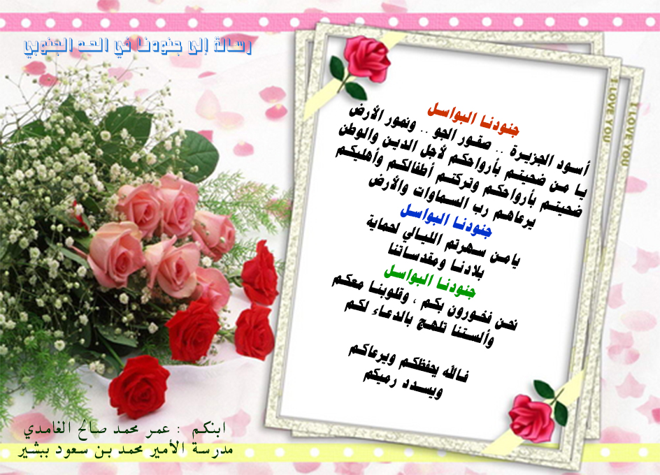 رسالة شكر جنودنا البواسل على الحد الجنوبي. رسالة الى جنودنا البواسل في الحد الجنوبي و كلمة شكر. وحرمها على النار وارفع منازلهم في دار الأبرار واجزهم عنا وعن أمة الإسلام خيرا. رسالة الى جندي على الحد الجنوبي. أنت الفخر ولك القدر العالي بين كل جنود الأمم والدول فأنت رمز للشجاعة رمز للرجولة رمز للشهامة سهرت ليرتاح المواطن وتعبت ليرتاح الحجيج ونصرت الجار بعد أن ضاقت به الحياة.