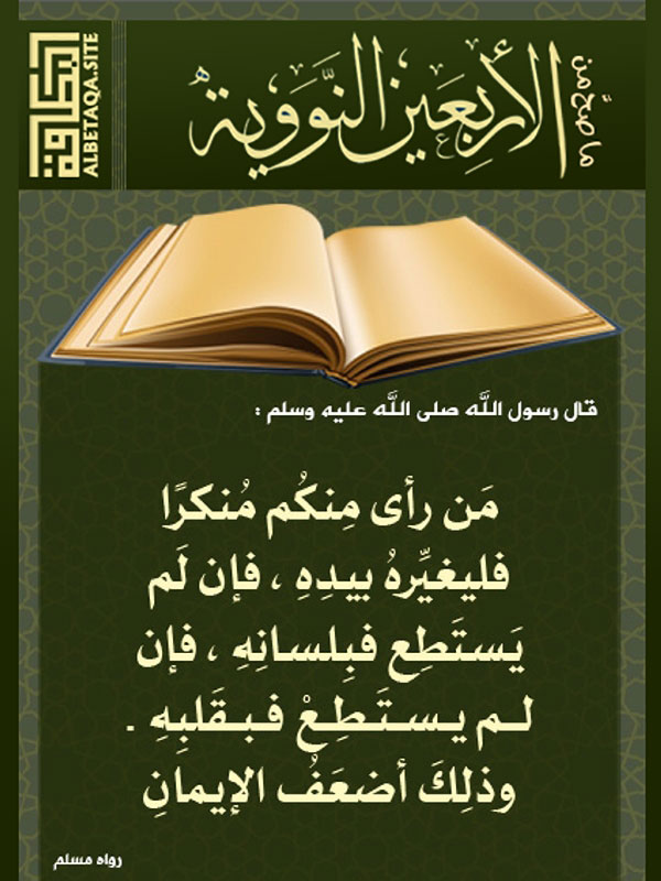 عن أبي سعيد الخدري رضي الله عنه قال. اللهم صل على سيدنا محمد عبدك ونبيك ورسولك النبي الأمي الذي ملأت قلبه بنور جلالك و. من رأى منكم منكر ا فليغيره بيده فإن لم يستطع فبلسانه فإن لم يستطع فبقلبه وذلك أضعف الإيمان. شرح حديث من رأى منكم منكرا فليغيره بيده فإن لم يستطع فبلسانه اقتباس.