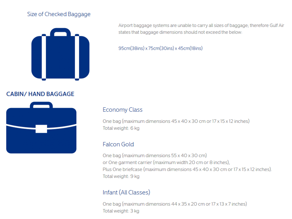 Gulf air baggage size 2020. Our falcon gold passengers can enjoy a generous allowance of two checked in baggage at 32kg each. Check out our official website and read all about almosafer guide to gulf air 2019 2020 baggage policy. Prepaid excess baggage can be added to your booking up to 25 hours prior to departure. Passengers will not be permitted to bring one 1 regular suitcase bag and one 1 cardboard box.